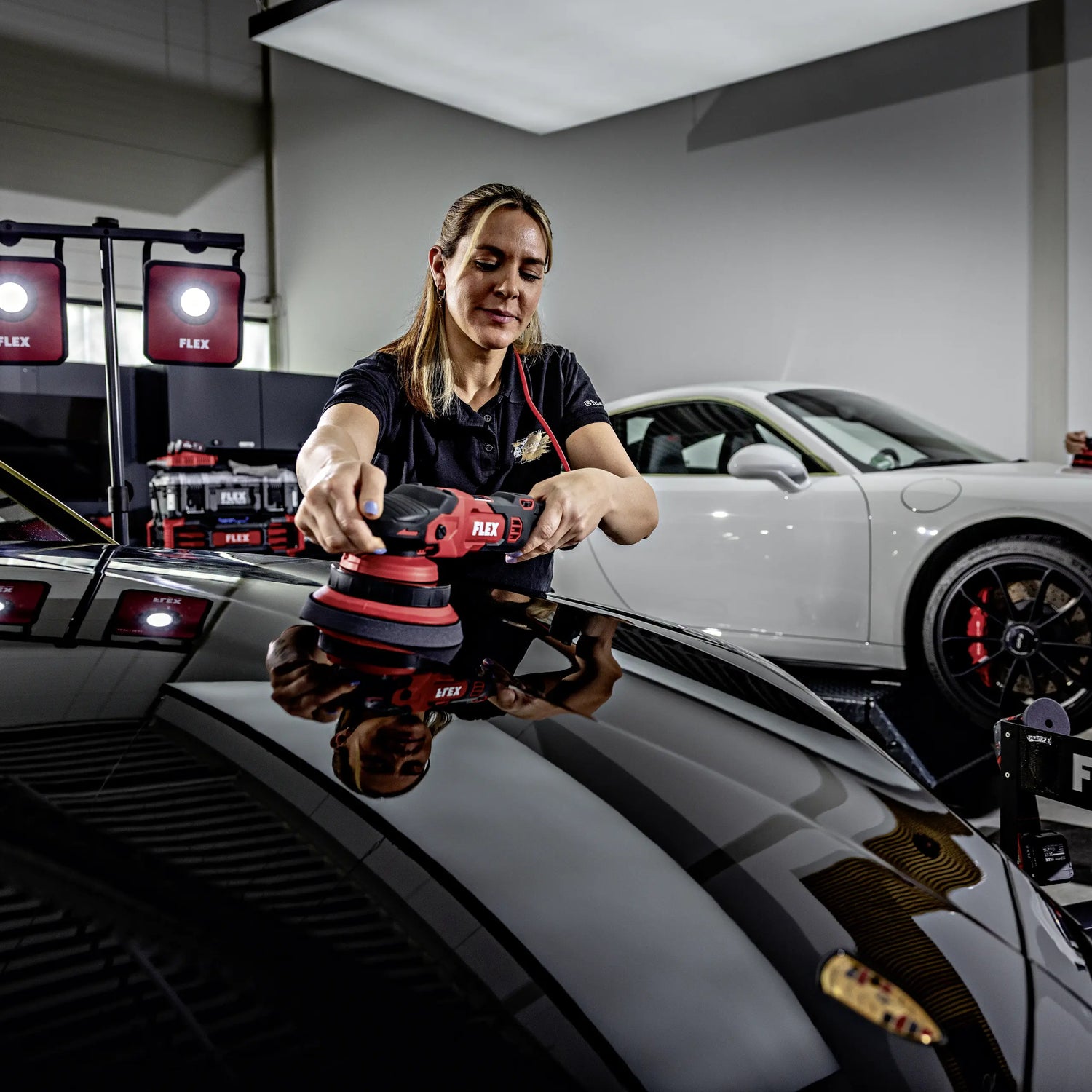 The free-running eccentric makes the machine particularly versatile. It is suitable for both one-step polishing processes, where defect correction and finish are combined, and for pure finishing passes, where maximum brilliance and deep gloss are the focus. Especially in combination with soft finishing pads and finely tuned polishes, an extremely clear paint surface with a strong mirror image is created.